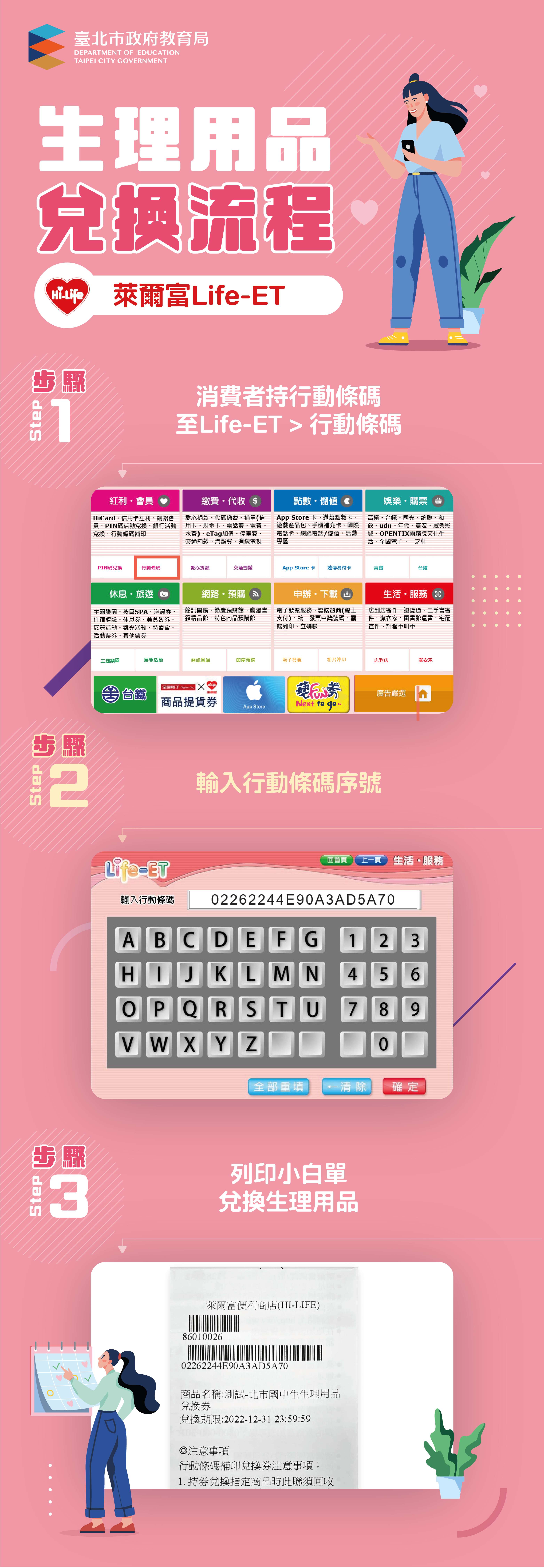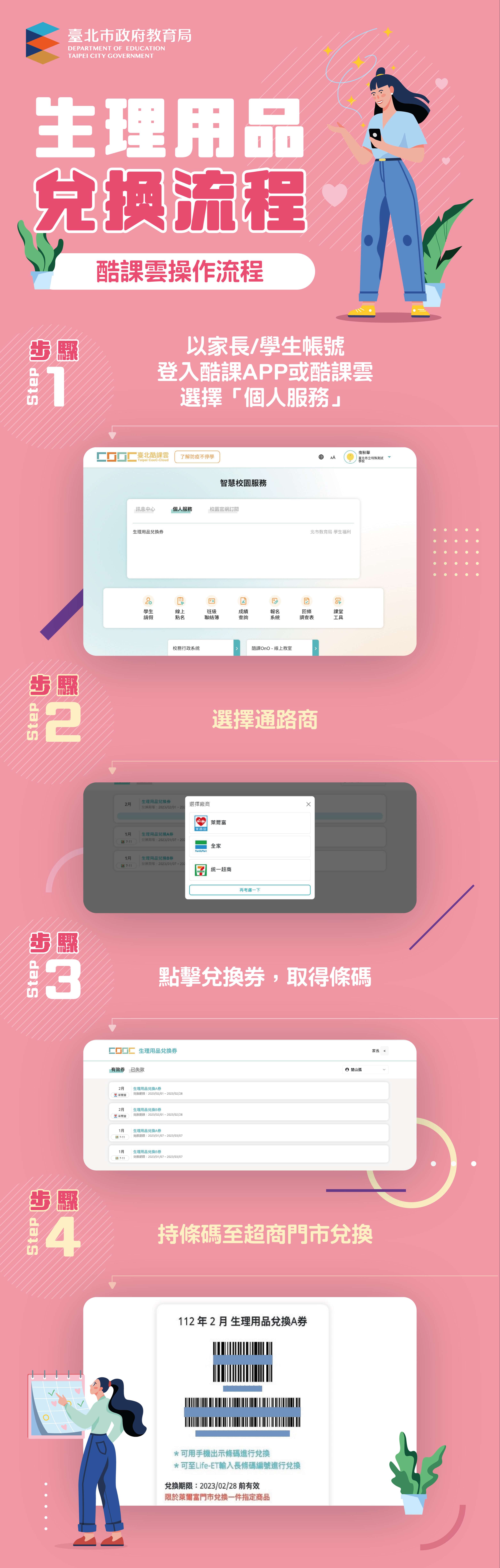 一、「112年國中小女性生理用品補助計畫」第1期兌換券2張, 將於3月1日發放,兌換效期至112年4月30日止。兌換方式 與流程,重點摘述如下: