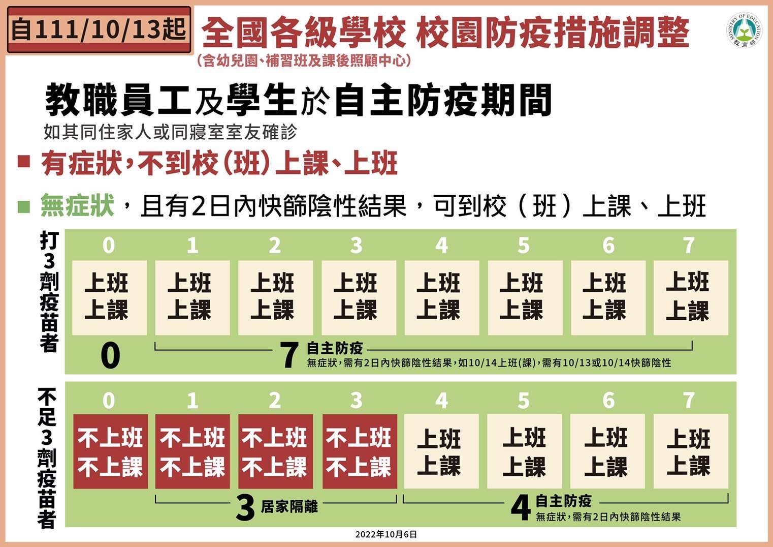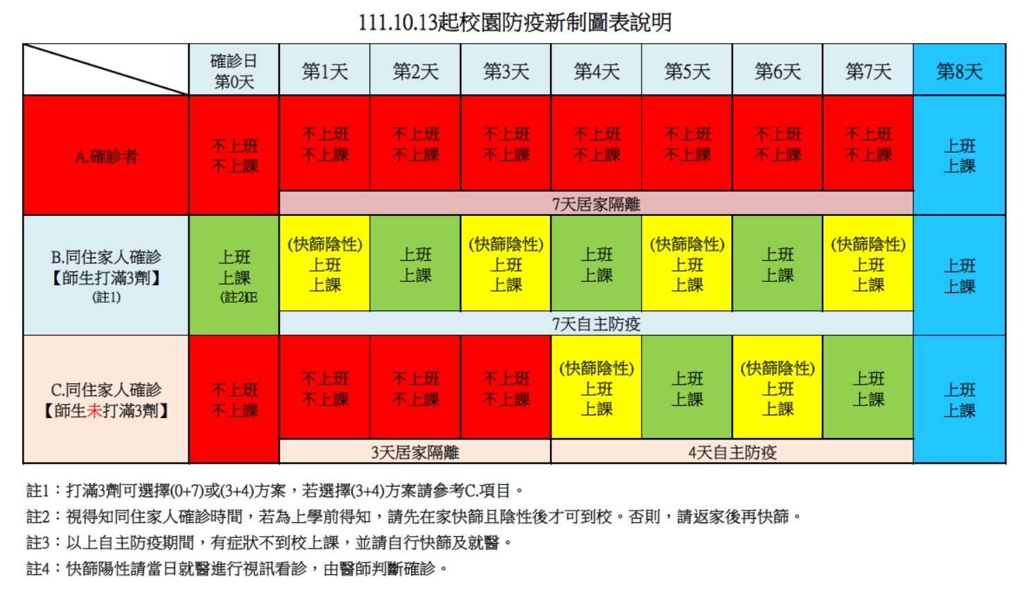 (1)「居檢0日+自主防疫7日」:7天自主防疫期間如無症狀,並每2日提供2日內「自費」快篩陰性證明者,可入校。