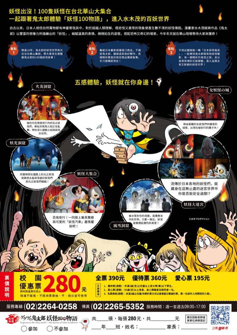二、「ゲゲゲの鬼太郎妖怪100物語」特展展覽訊息如下: (一)展覽時間:111年12月31日(六)~112年4月5日(三),除夕 休館。營業時間:10:00~18:00(17:30停止售票及入 場)(二)展覽地點:華山1914文創產業園區西1、西2館。 (三)展覽介紹: 1、妖光洞窟:有如蜿蜒洞窟般的空間內,數道光芒灑落 就像水晶球般閃閃發光!一同欣賞映照在牆壁上的光 之妖怪,或是窺視位於水晶球深處的妖怪們,與光之 妖怪們嬉戲! 2、妖怪大迷宮:自古以來流傳於日本各地,多樣且各有 特色的妖怪們,就藏身在這無止盡的迷宮世界中。一 個接著一個的妖怪將與你相遇,你是否能安全過 關!? 3、女妖怪の城:神祕美豔的女妖怪們所棲息的城堡,出 現在被封印的鏡子內,你將能欣賞她們各自妖豔美麗 的身姿! 4、火炎洞窟:被封印在燃燒洞穴內的炎之妖怪們,鮮紅 的熊熊火焰正在亂舞,帶你深入體驗火焰與妖怪的世 界。 5、風雪洞窟:被冰雪封住的洞窟,是萬物冰冷結凍的世 界。小心!只要你一接近,妖怪就會捲起激烈的風雪 來嚇你喔! 6、妖怪大集合:百鬼夜行!還有更多意想不到的新奇妖 怪在此集結!一同搭上兼具震撼與可愛的「妖怪汽 車」盡情擺拍吧! 7、鬼太郎神社:必訪!會場限定看展求籤詩!獨家詩籤 等你參拜收藏!(現場另外收費)
