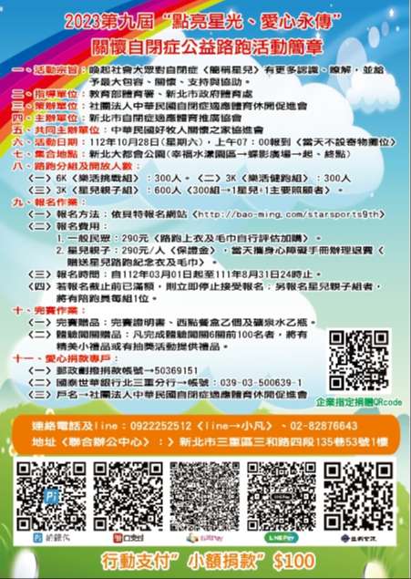 2、星兒親子: 290元/人〈保證金〉,當天攜身心障礙手冊現場辦理退費〈贈送星兒路跑記念衣及毛巾〉。