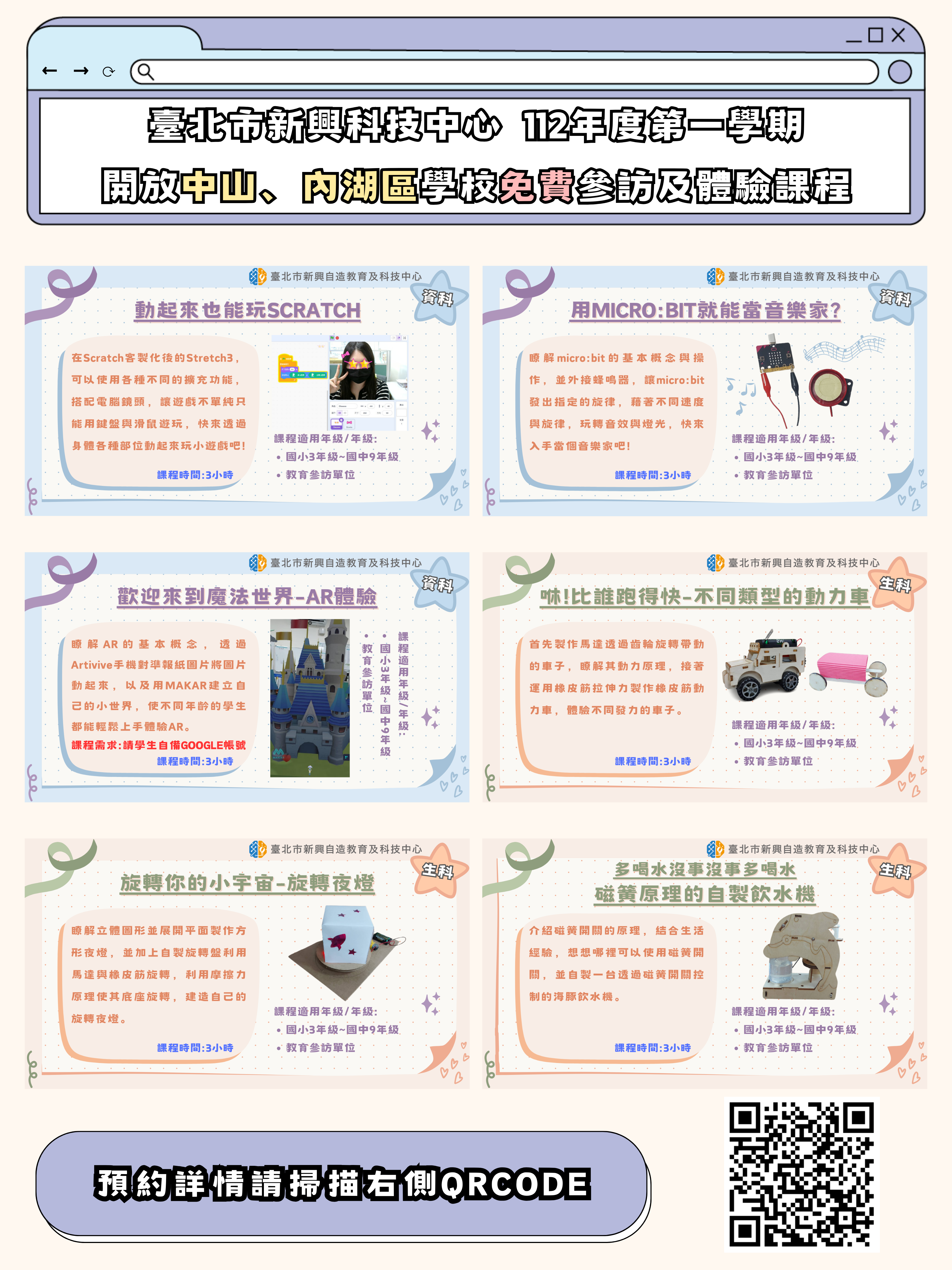 三、相關免費體驗學習之活動實施計畫、課程內容及宣傳海報 檔、申請條件請詳見附件。