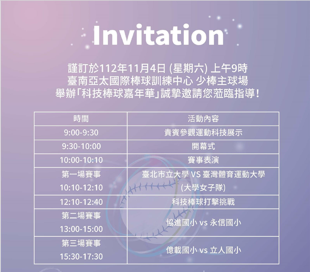 二、旨揭活動藉由運動科技結合棒球之表演賽,打造出科技棒球嘉年華,用以推廣棒球運動,讓各級棒球運動選手體驗科技訓練,讓民眾享受運動科技應用於賽事觀賞的新體驗。