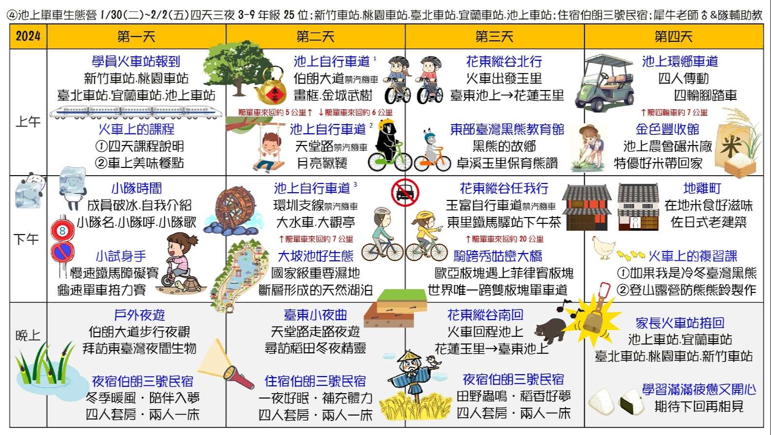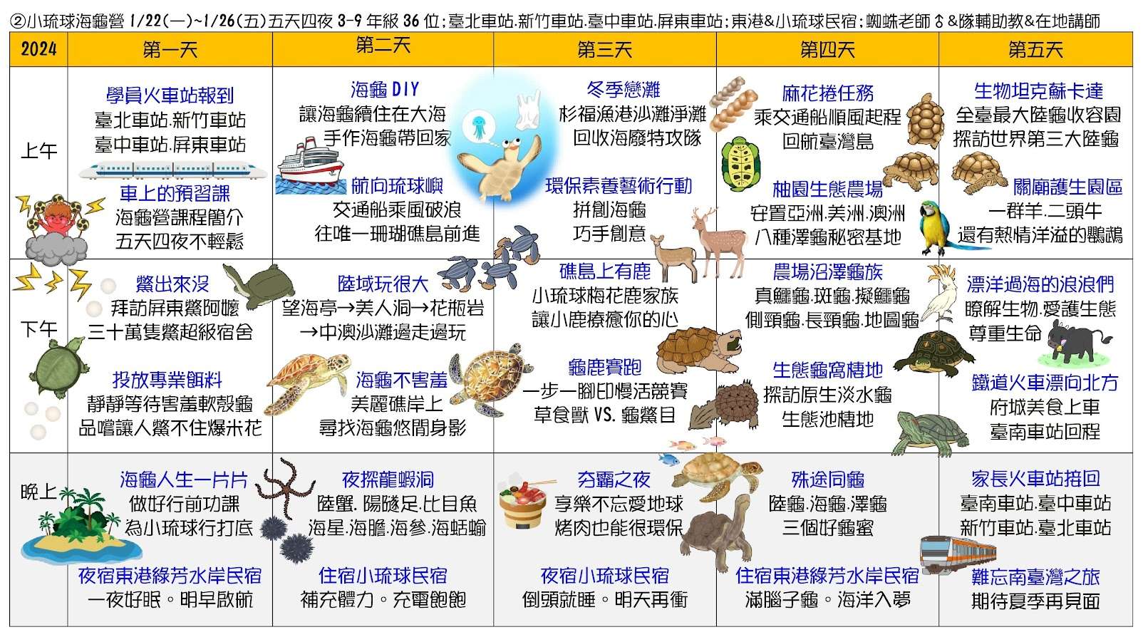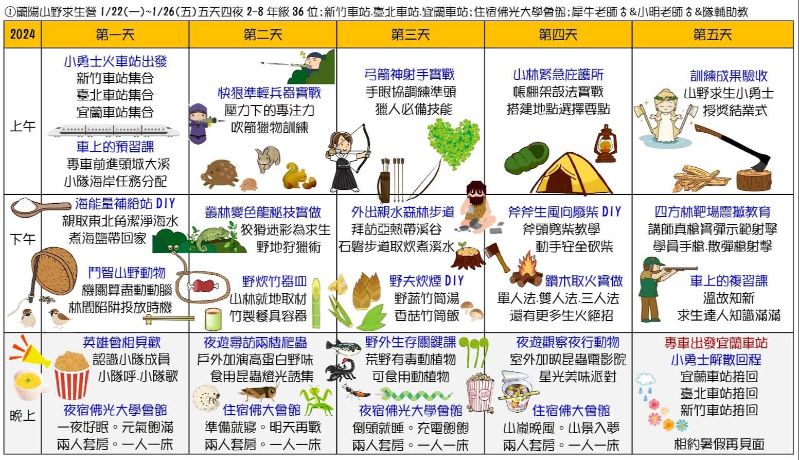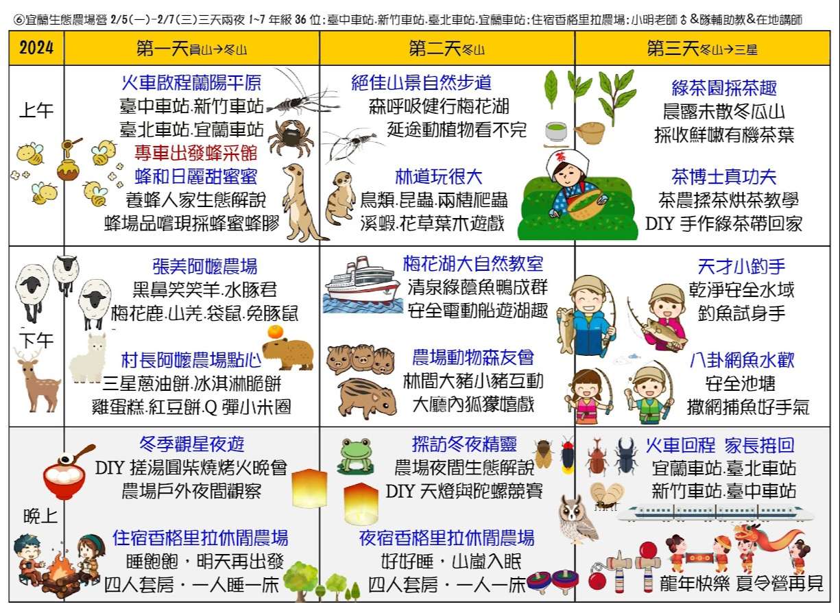 二、六種課程主題為:①蘭陽山野求生營(5天4夜)、②小琉球 海龜營(5天4夜)、③仿生科技營(3天2夜)、④貓頭鷹飛羽 營(4天3夜)、⑤池上單車生態營(4天3夜)、⑥宜蘭生態農 場營(3天2夜)。