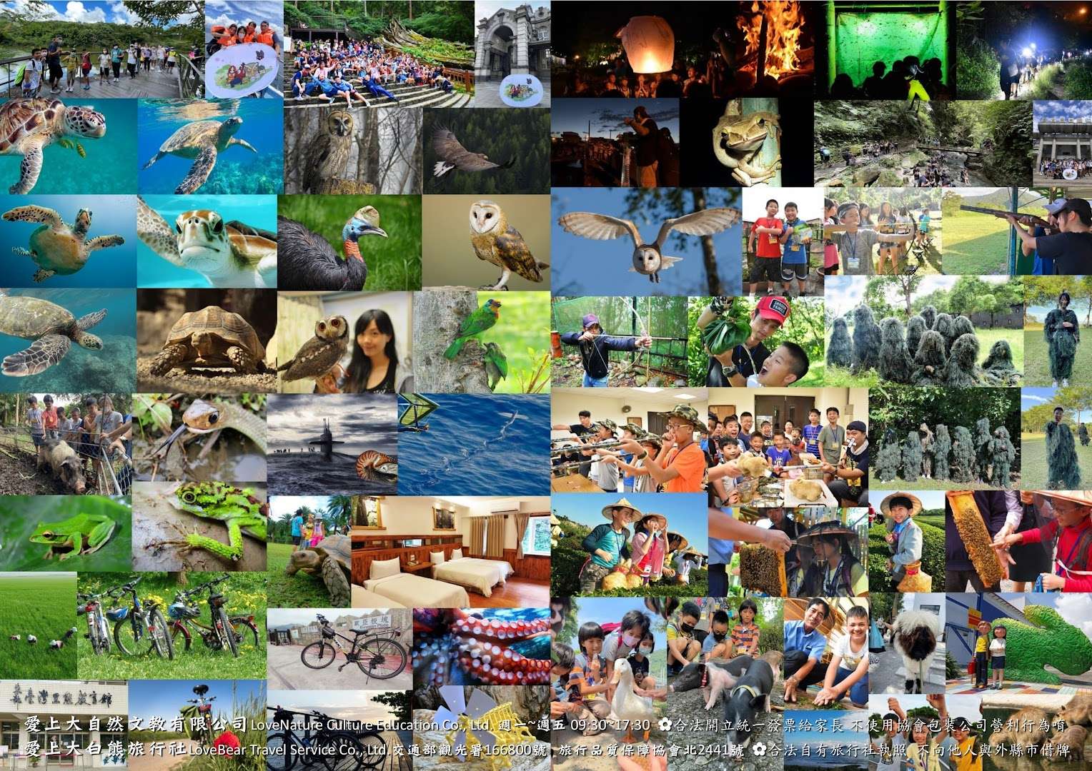 四、提醒各位師長與家長:①依我國法令規定,辦理外出營隊 與過夜營隊,招生單位需自有旅行社執照,不可向他人靠 行或向外縣市旅行社借牌,才是合法有保障的營隊。②愛 上大自然文教合法開立統一發票給每位學員家長,不以 「非營利協會」包裝公司營利行為。③「愛上大自然文 教」與「愛上大白熊旅行社」合法登記,兩單位共同經 營,課程皆為學員.講師.助教,投保足額南山人壽平安保 險,讓您安心放心。