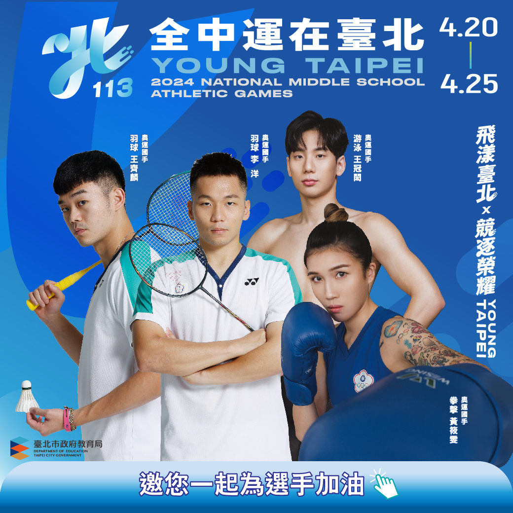 三、113年全中運在臺北,精彩賽事將於4 月20日開始,臺北市政府教育局竭力提供全國選手及民眾一流服務,規劃許多全國首創活動,請搜尋「113全中運」,各項活動、優惠、競賽資訊一次看!讓我們一起為全中運選手加油!