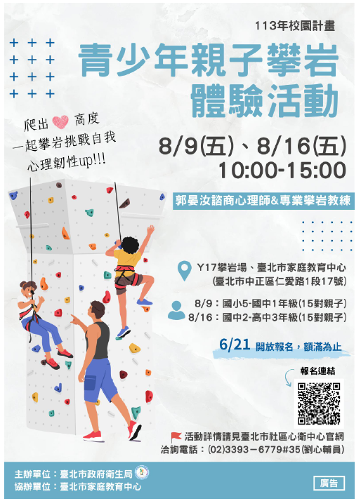 (二)活動地點:臺北市家庭教育中心9樓攀岩場及6樓教室(臺北市中正區仁愛路一段17號)。