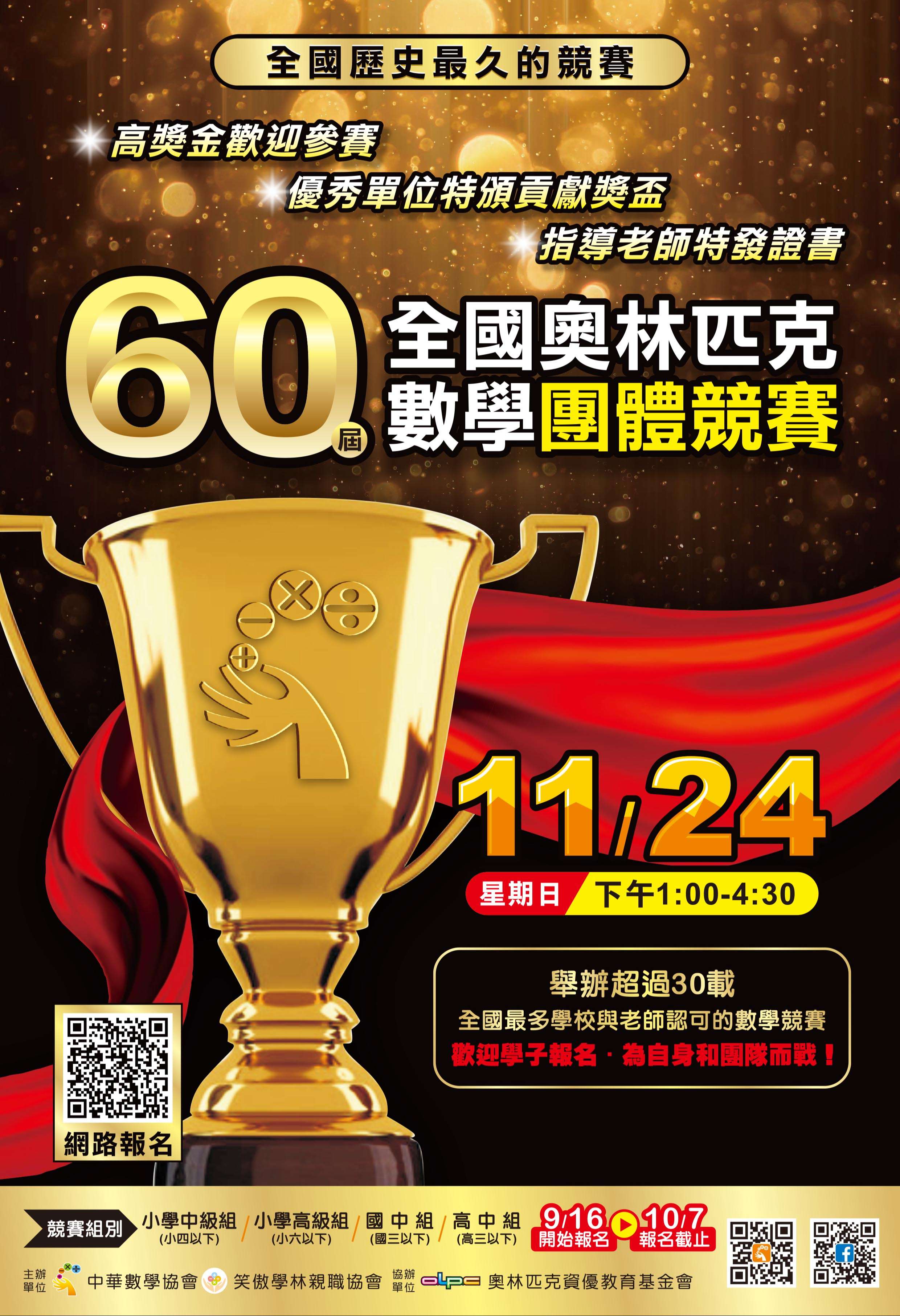 二、檢附「第60屆全國奧林匹克數學團體競賽」競賽活動相關簡章,供貴校參閱。競賽報名的起訖時間為113年9月16 日至113年10月7日止。