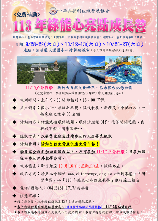 十一、報名方式:請至本會網站www.chinesenpo.org.tw→活動 專區→『研習專區』→『【台北體驗營】113年綠能心亮 點成長營』進行線上報名。