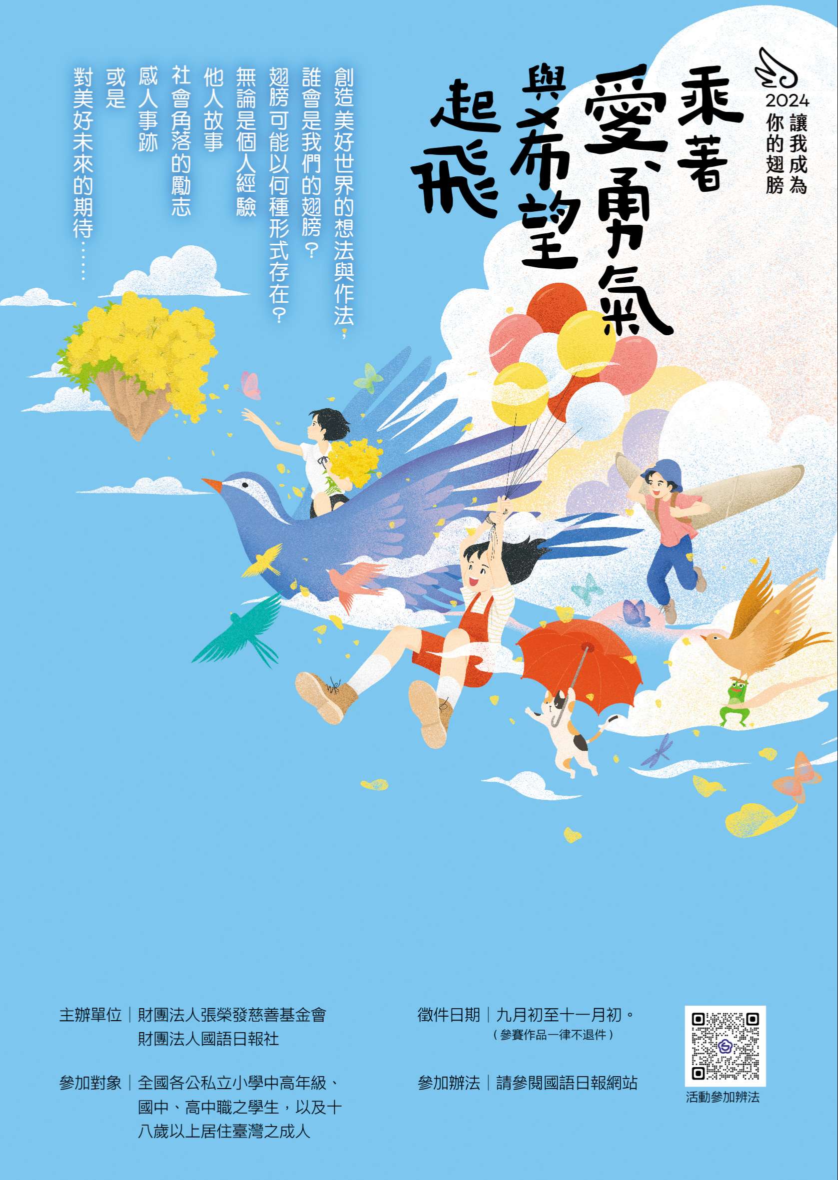 說明: 一、為了鼓勵正面助人的精神,強調社會連結與人際支持的重 要,本社與張榮發慈善基金會合辦「2024讓我成為你的翅 膀──乘著愛、勇氣與希望起飛」徵件活動。 二、惠請 貴校師長藉由「讓我成為你的翅膀」主題,輔導學生 發揮創意與想像,用圖畫分享對創造美好世界的想法與作 法。本活動徵件時間自即日起至113年10月31日止。 三、徵稿活動相關資訊及報名資料下載,請參見「2024讓我成 為你的翅膀──乘著愛、勇氣與希望起飛」徵件活動網站 (QR Code參見附件);或致電活動小組,電話(02) 2392-1133分機1305(請於週一至週五9:30-12:00、14:00- 17:00來電)。 四、參賽者可以聆聽〈讓我成為你的翅膀〉歌曲作為發想參考,但不需受其局限。