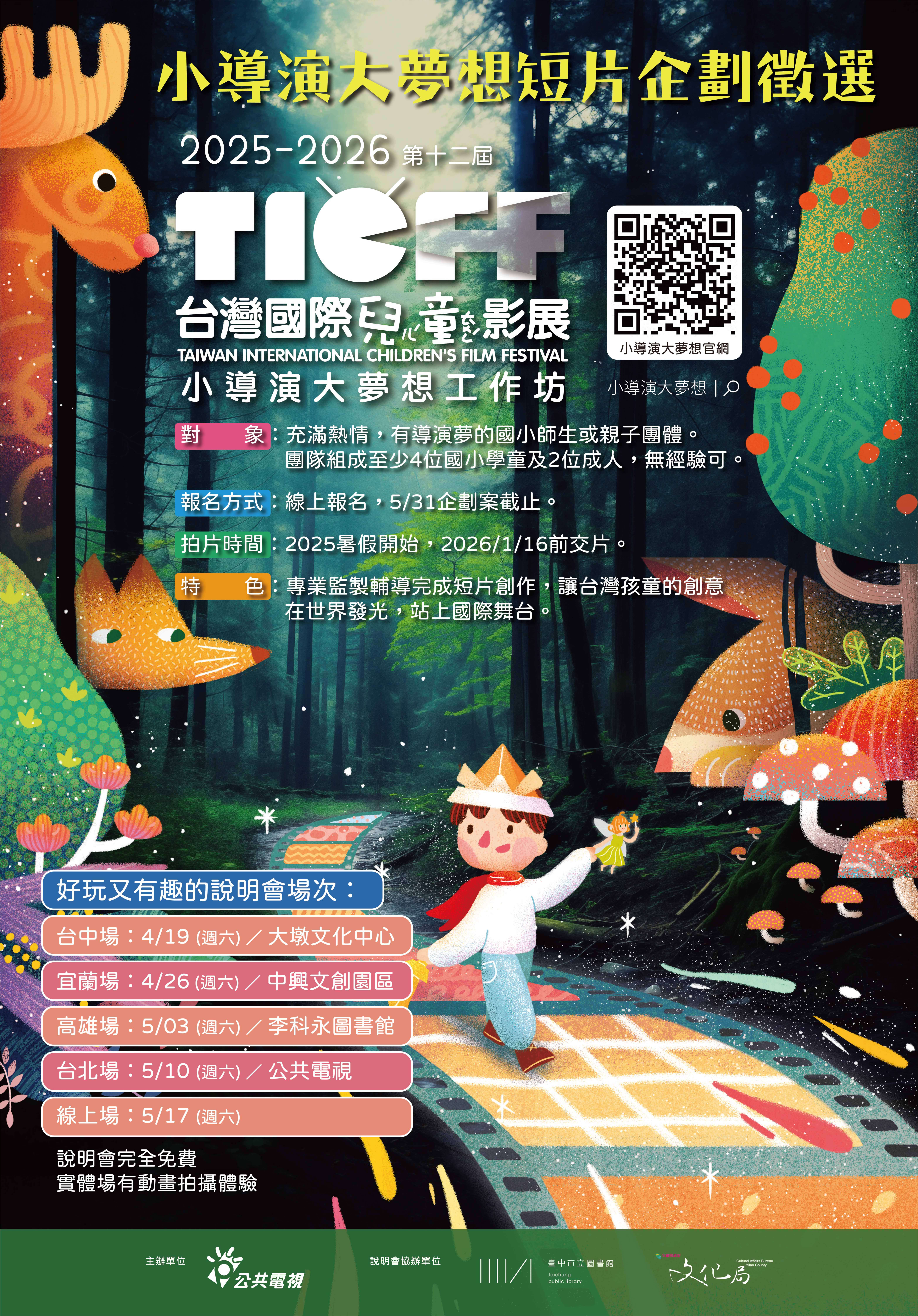 說明: 一、公視為推廣兒少影像教育,透過「小導演大夢想工作坊」 兒童影像教育計畫,號召對影像創作感興趣的國小師生、 親子團隊,先徵件再提供培訓輔導的方式,鼓勵組隊參與 短片創作。歷屆經工作坊輔導所完成優質作品在國內外各 大兒童影展屢獲獎勵肯定,讓台灣兒童創意在國際上綻放 光芒。二、公視2025「小導演大夢想工作坊」即將開跑,本會將舉辦 「短片創作說明會」說明參加辦法及相關活動內容。說明 會場次為2025/4/19台中大墩文化中心、4/26宜蘭中興文創 園區、5/3高雄李科永圖書館、5/10台北公共電視、5/17線上場。邀請專業影像工作者教授拍片企劃案撰寫、及小導 演團隊分享拍片趣事,歡迎踴躍參加。說明會活動全程免 費,請於活動官網線上報名。 三、「兒童短片企劃案徵選」於2025/5/31截止收件,歡迎國小 師生、親子團隊組隊上網報名。提出拍片企劃參加徵選, 入選團隊可享整套拍片輔導資源,完成短片擇優送國際參 展。相關活動細節請上活動官網 https://www.pts.org.tw /dreamer12/