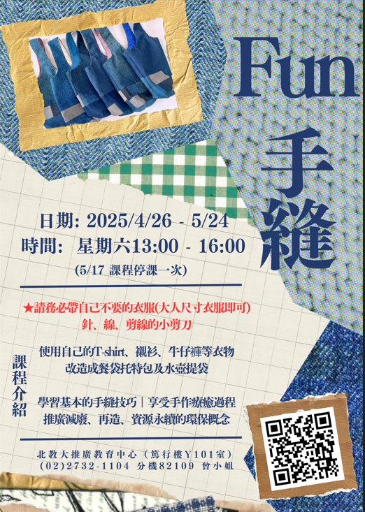 課程相關報名網址如下:Fun手縫(HandMay五月 場) https://cce.ntue.edu.tw/course/5629。