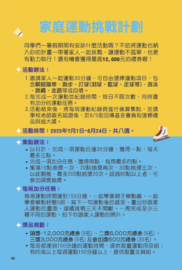 3.活動結束後,將每周運動紀錄頁進行換算集點,並請學校老師簽名認證後,於9/5前回傳基金會換取達標禮品及抽大獎。