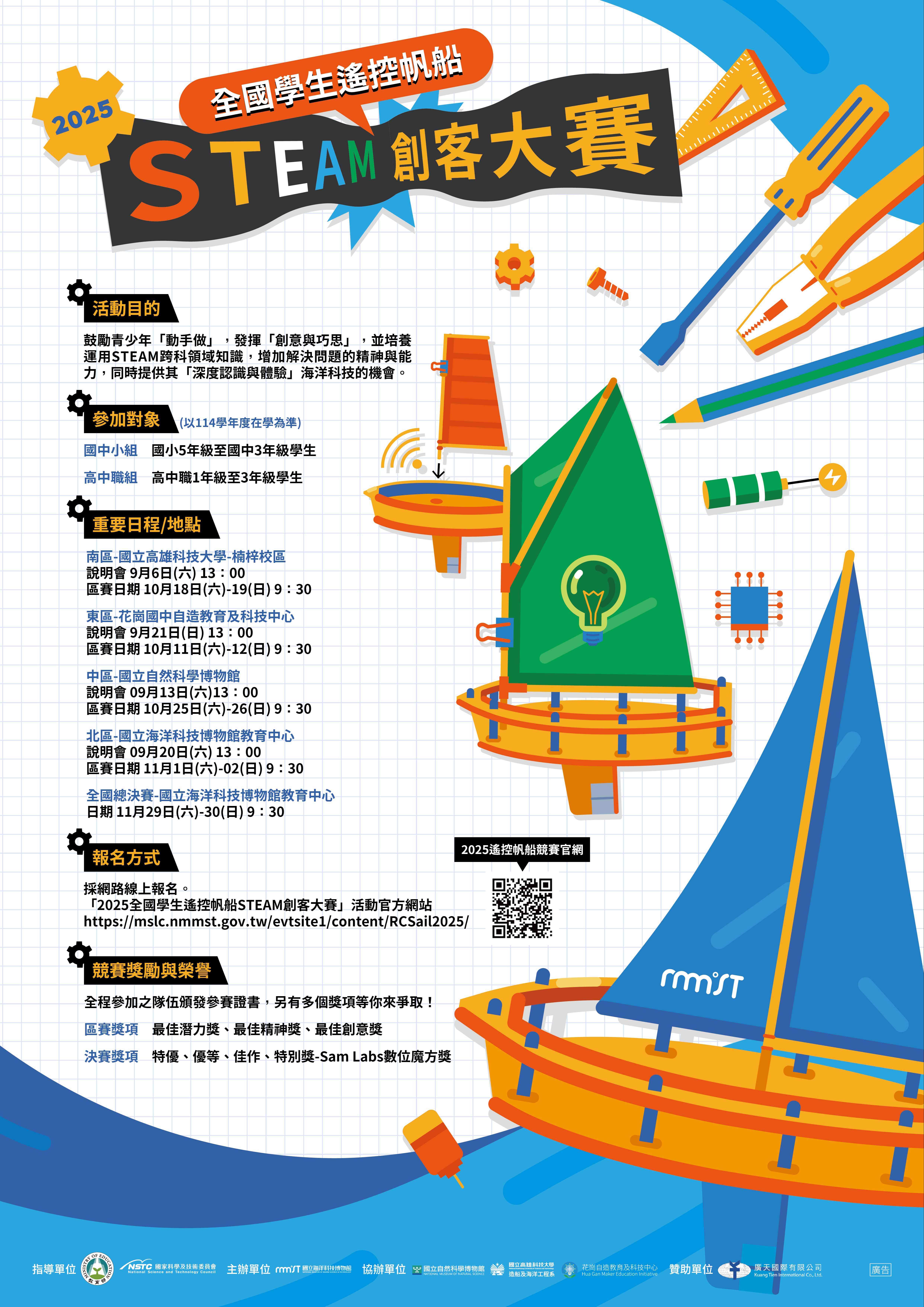 四、活動詳情與報名請參閱活動簡章,或至「2025全國學生遙 控帆船STEAM創客大賽」活動官網https://mslc.nmmst. gov.tw/evtsite1/content/RCSail2025/