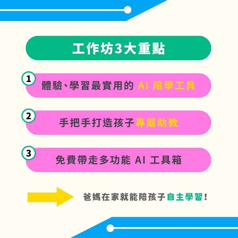 說明:為協助家長、教育者掌握數位時代孩子學習陪伴之策略, 本會特舉辦「全年無休的助教存在嗎?!用 AI 打造孩子 的自主學習力!」 AI陪學工具工作坊。活動將由於AI教學 經驗豐富的跨領域專業講師「方方老師」帶領,透過實作 教學與實務分享,協助成人善用AI工具,強化孩子自主學 習、資訊素養與思辨能力,無論是想陪伴孩子深度探索學 習的家長、或是教育者皆可參與。活動內容整合本會多年 親子服務經驗所發展之「培力五階段」教學架構,結合講 師的專業技能,期能深化家庭端的學習支持系統、開發教 育者於教學現場的更多可能,促進家長、教師與孩子共同 成長。敬請貴校惠予協助,於校內網站或對家長之聯繫平 台公告活動資訊,邀請對相關議題有興趣之成人踴躍報名 參加。活動資訊如下: