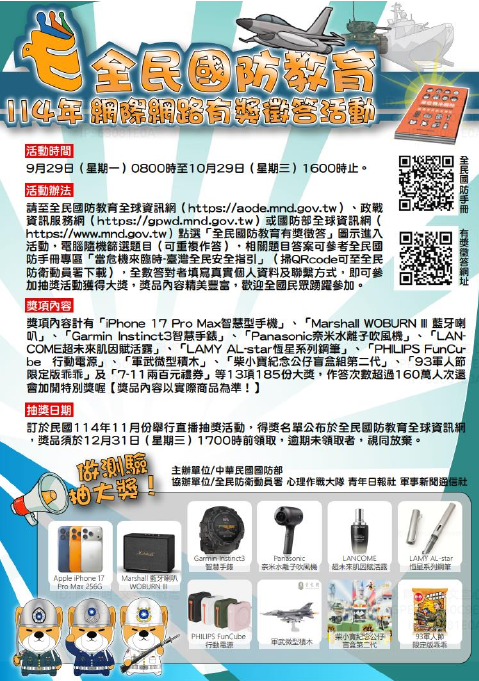 國防部辦理「全民國防教育網際網路有獎徵答活 動」,活動自9月29日8時至10月29日16時止,答對者可抽智慧型手機、藍芽喇叭、智慧手錶,歡迎民眾踴躍參