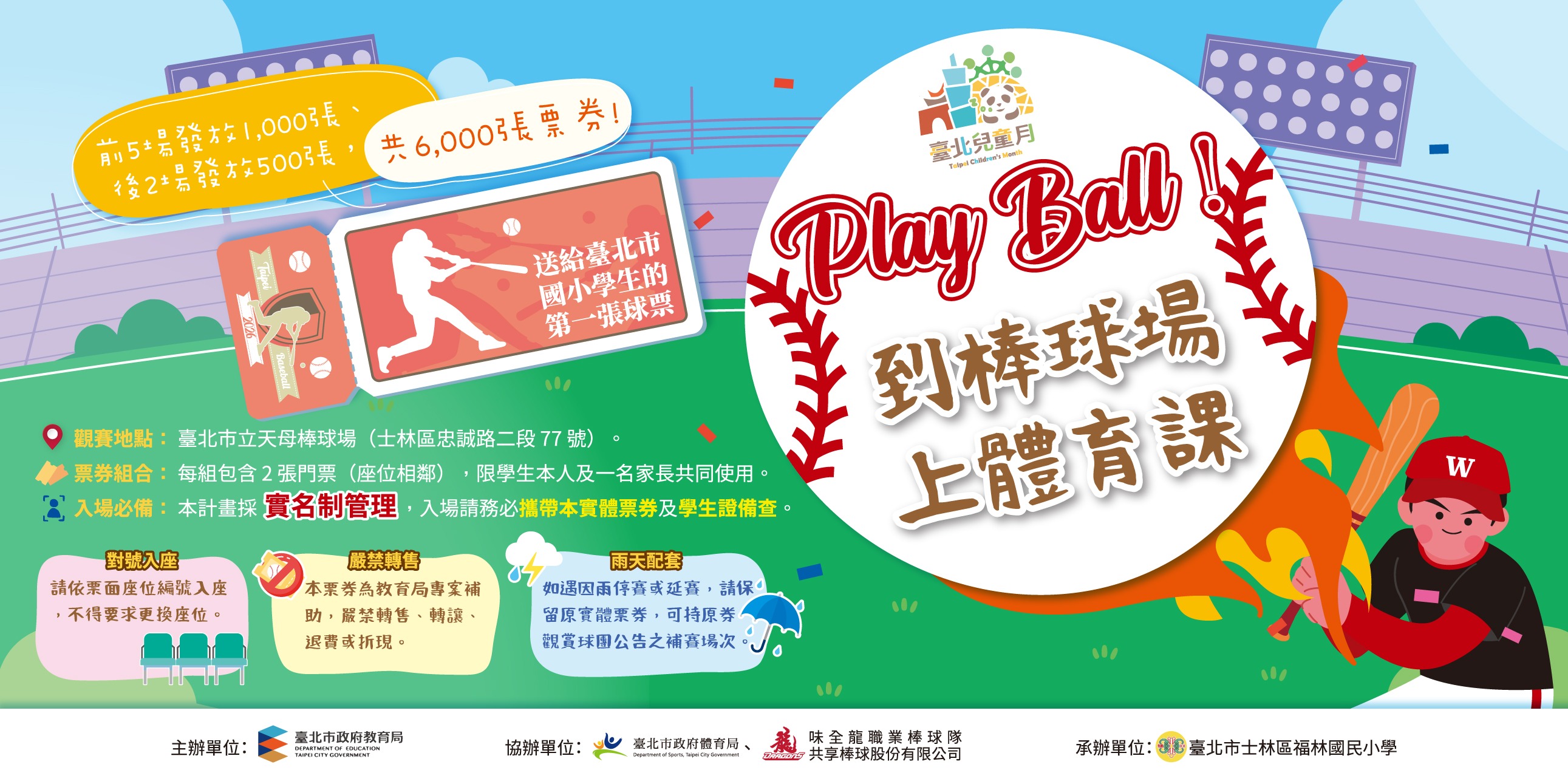 一、為培養學生運動素養,並結合本市指標性運動場域資源, 本局結合4月兒童月規劃補助學生進場觀賞職業棒球賽事, 落實體育學習走出校園。