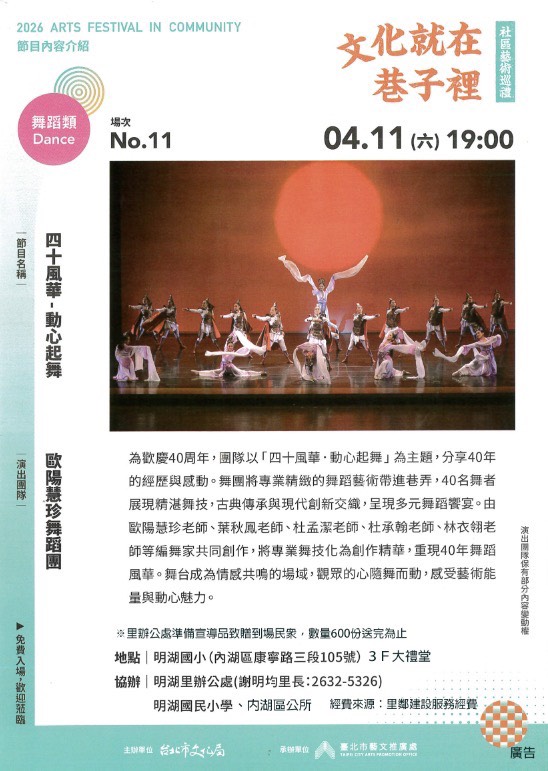 歐陽慧珍舞蹈團於本校禮堂演出,歡迎闔家觀賞。