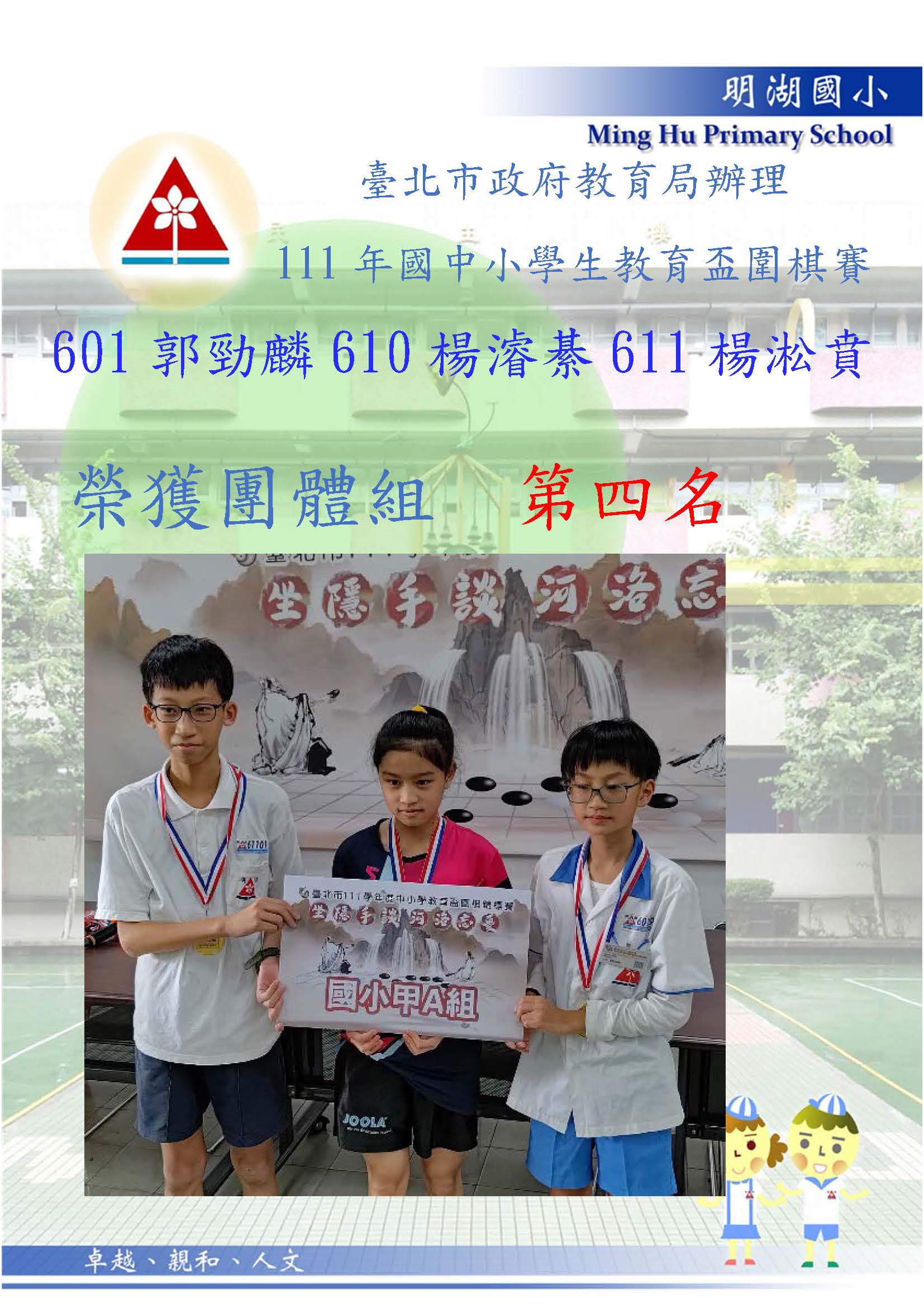 本校601郭勁麟610楊濬綦611楊淞賁等三位同學,參加111學年度台北市教育盃團體組圍棋賽,獲四勝一敗佳績,得到團體組第四名,特此恭賀!