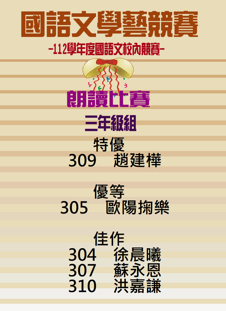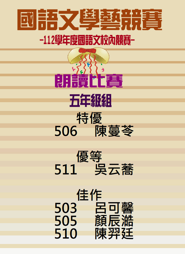 112學年度校內多語文競賽-國語朗讀比賽獲獎名單