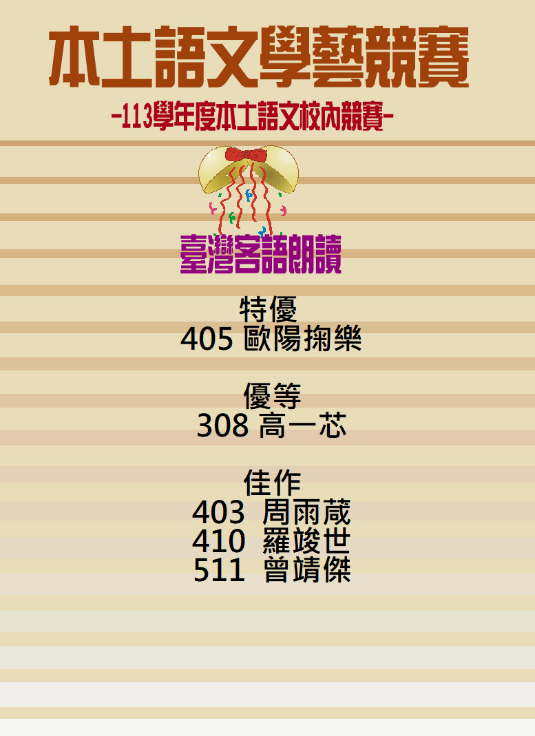 113學年校內本土語文學藝競賽-臺灣客語朗讀獲獎名單