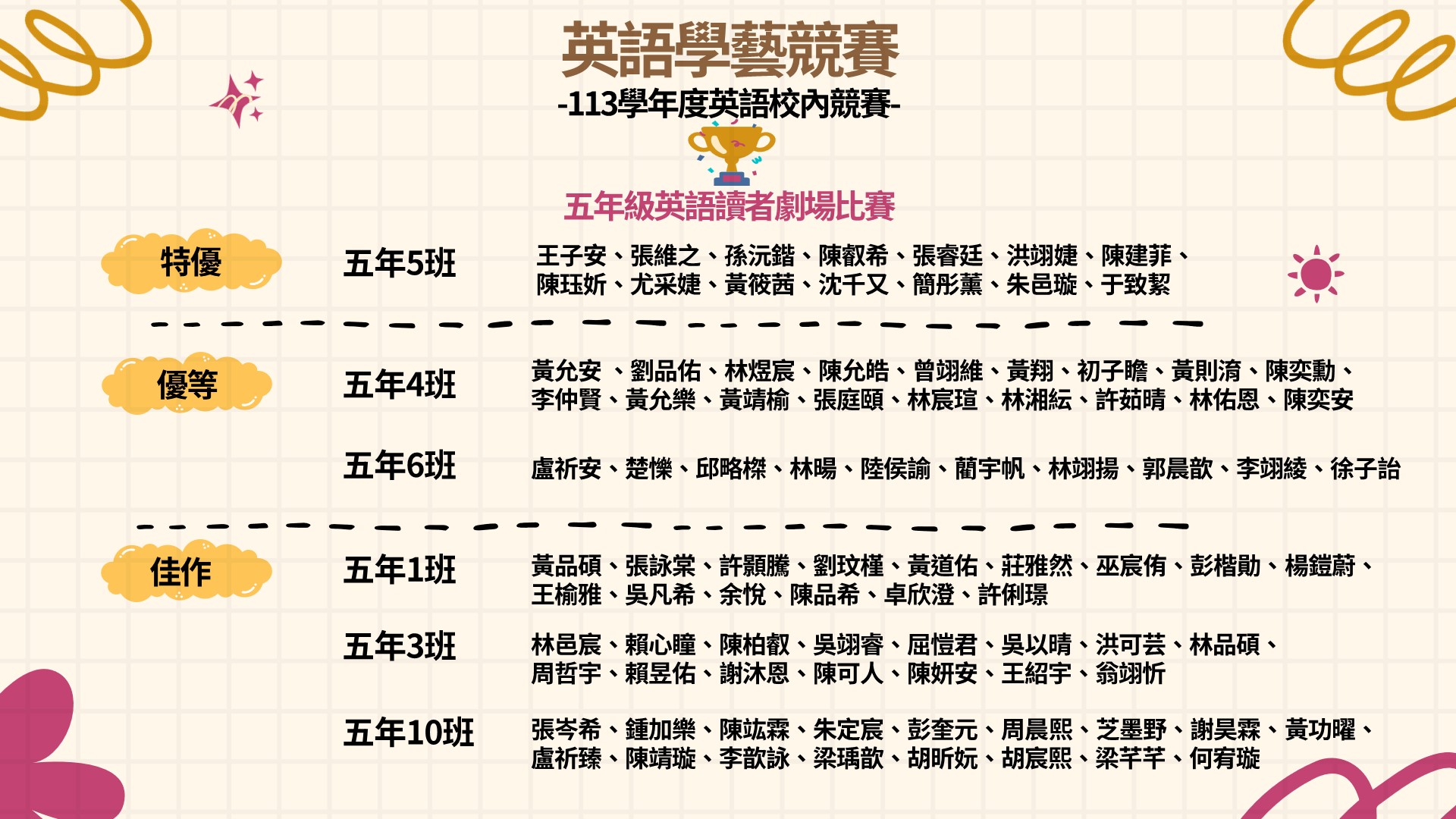 113學年度校內多語文競賽-五年級英語讀者劇場獲獎名單